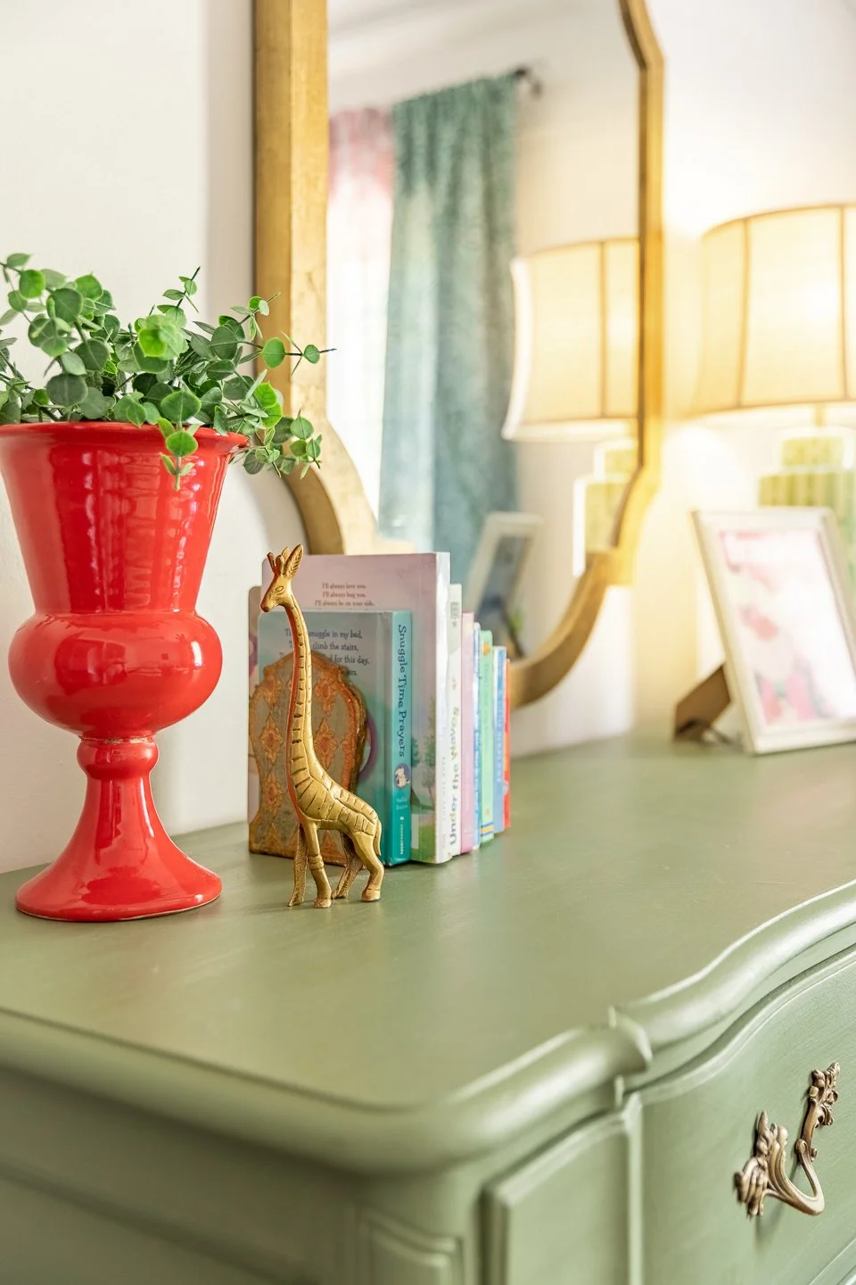 The rest of the room is full of greens, golds, and a mix of other pastels. I spent time searching for sweet vintage pieces to complete the space and to give it a truly customized and thoughtful room with loads of personality.